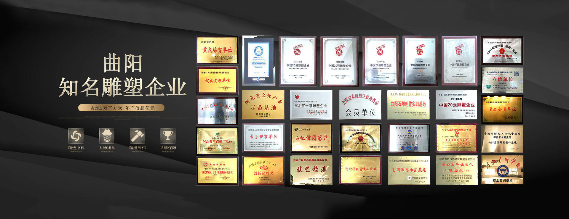 同時,公司也是行業(yè)內(nèi)的佼佼者,連續(xù)七年榮獲“中國20強(qiáng)雕塑企業(yè)”,并被命名為“全國雕塑示范基地”,在國內(nèi)外雕塑藝術(shù)領(lǐng)域享有較高聲譽(yù)。2017年,曲陽縣河北鑫特園林雕塑公司還被文化部、教育部、人社部命名為“中國非遺石雕傳承人群研培實訓(xùn)基地”。